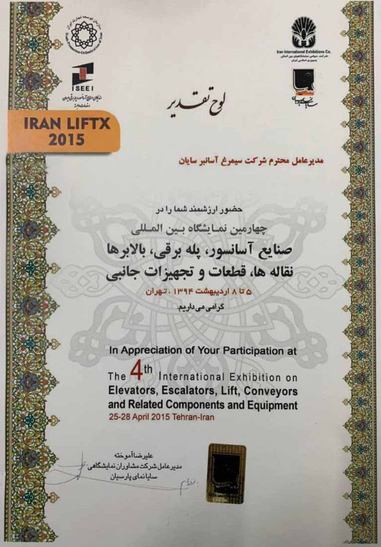 این سازمان رضایت و مراتب تقدیر خود را از عملکرد شرکت سیمرغ آسانبر سایان طی مدت قرارداد انجام عملیات سرویس و نگهداری آسانسورهای ساختمان های ستادی اعلام می نماید.
